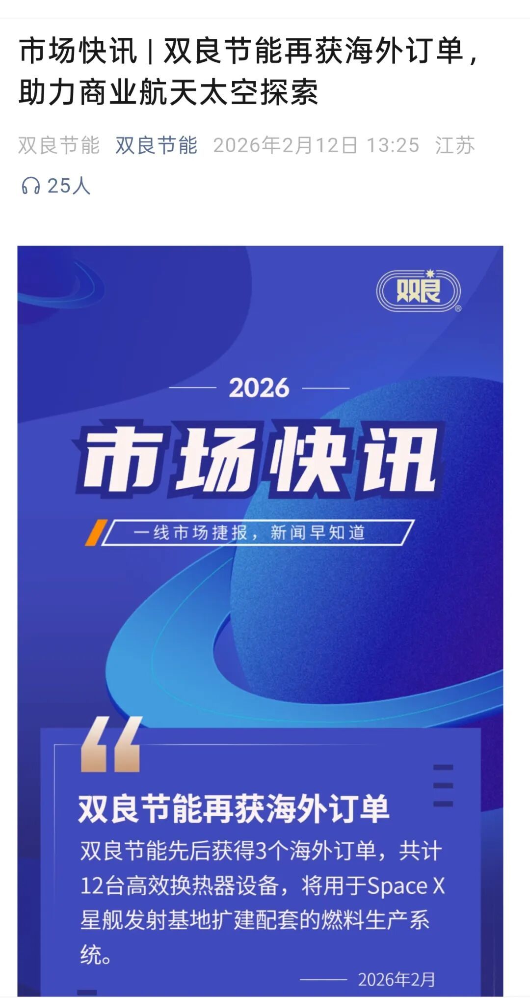 2月12日13时25分,公司公众号发布快讯称,已先后获得3个海外订单,共计12台高效换热器设备,这些设备将用于SpaceX星舰发射基地扩建配套的燃料生产系统。公司还提到,这是继前期合作后再度供货,以此体现海外客户对其产品的认可。