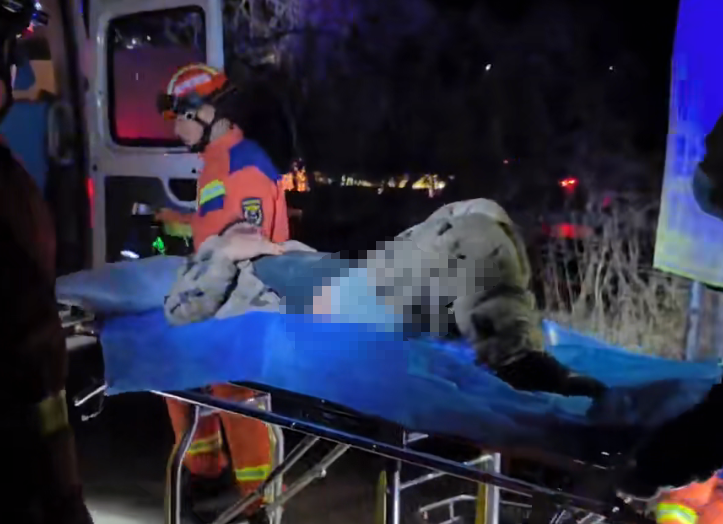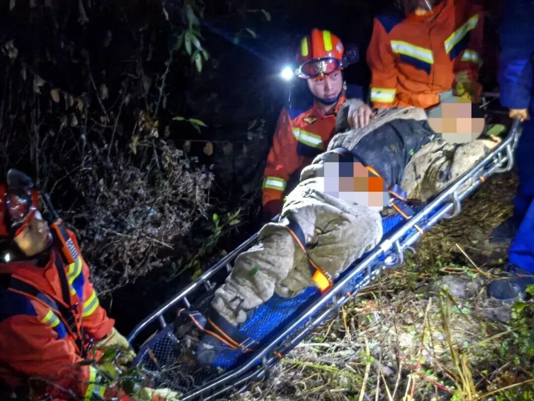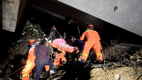 消防员抵达现场时,能见度低给救援增加了难度。他们做好安全警戒后,携带担架徒步绕至桥下施救。到达男子身边后,救援人员初步检查发现,他意识清醒,但腰部、腿部、脚踝多处骨折,无法动弹。