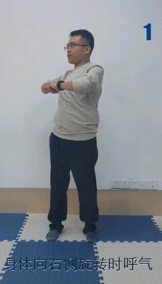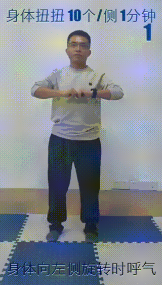 身体扭扭:身体向左侧旋转时呼气,每侧练习10个;向右侧旋转时同样呼气,每侧练习10个。