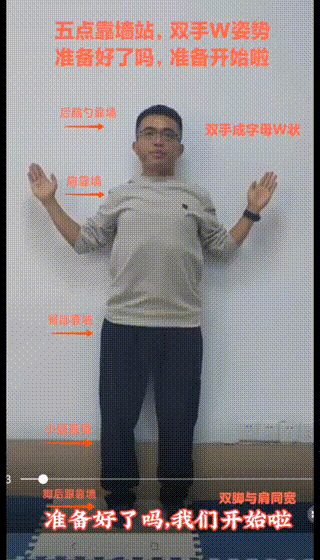 W康复操:双手摆出字母W姿势,五点靠墙站立(后脑勺、肩膀、臀部、小腿、脚后跟),重点是双脚与肩同宽,练习10个。