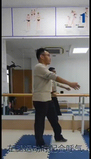 步态及肌肉功能训练:右腿运动时配合呼气,每侧练习10个;左腿运动时同样配合呼气,每侧练习10个。