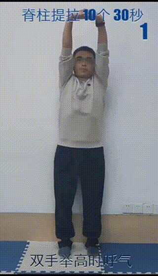 脊柱提拉:重点是双手举高时呼气,练习10个。