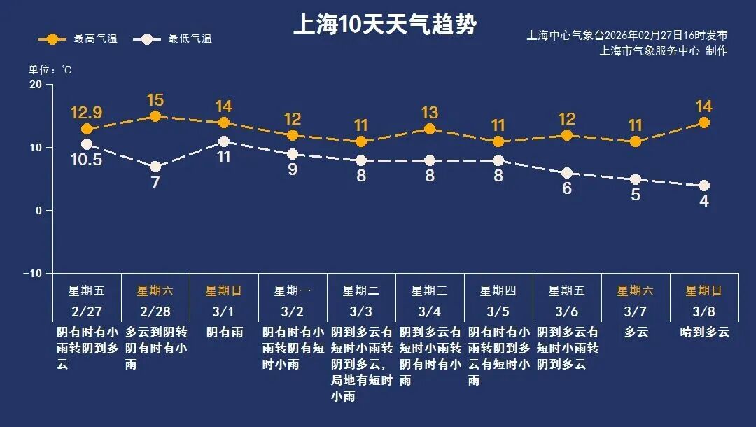 受短波槽影响,今日夜间起上海将再次出现降水,周日雨势较为明显,主要降水时段在周日下午至夜间。三月初暖湿气流活跃,受其影响,下周工作日上海多小雨天气,下周一前后低压入海时还会伴有大风。阴雨天气预计持续到周五左右,下周双休日天气转好,阳光回归。气温整体波动不大,下周工作日气温6~13℃,但阴雨导致体感偏湿冷,需注意保暖防雨。