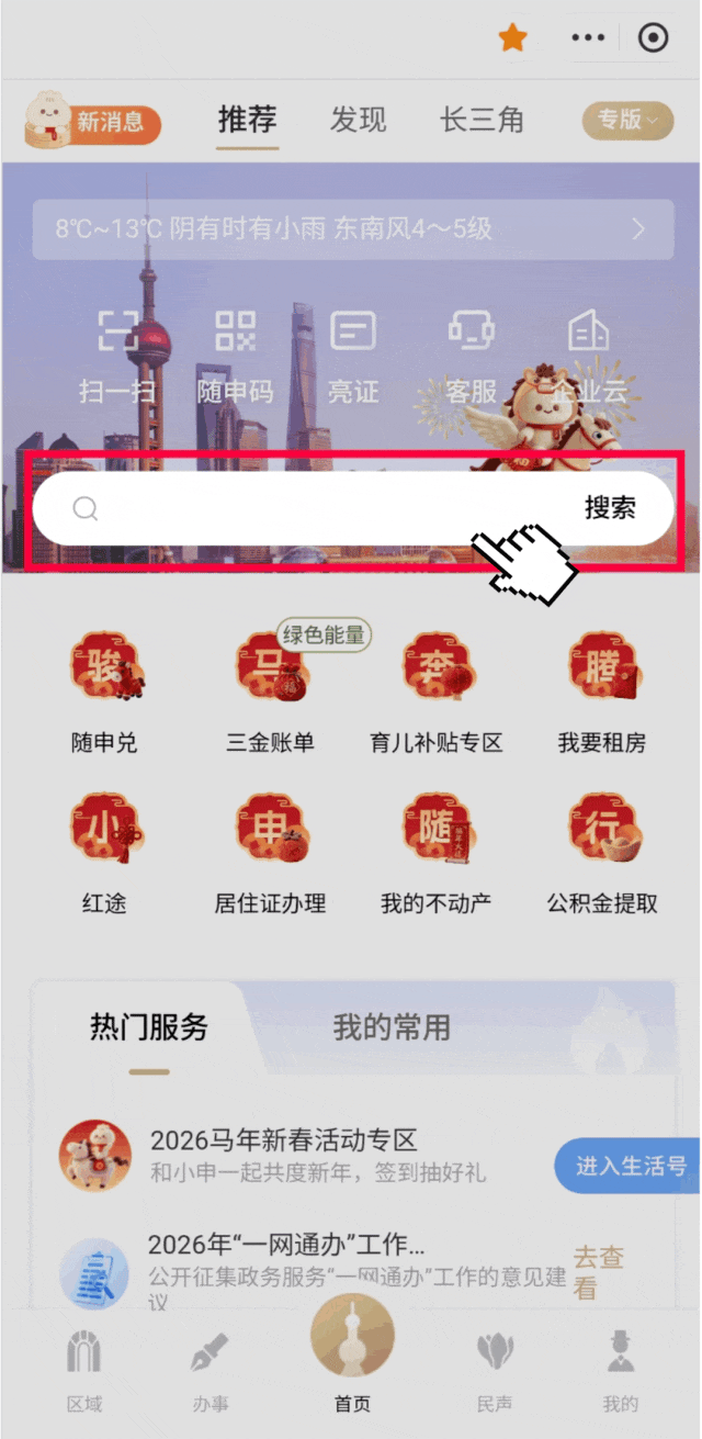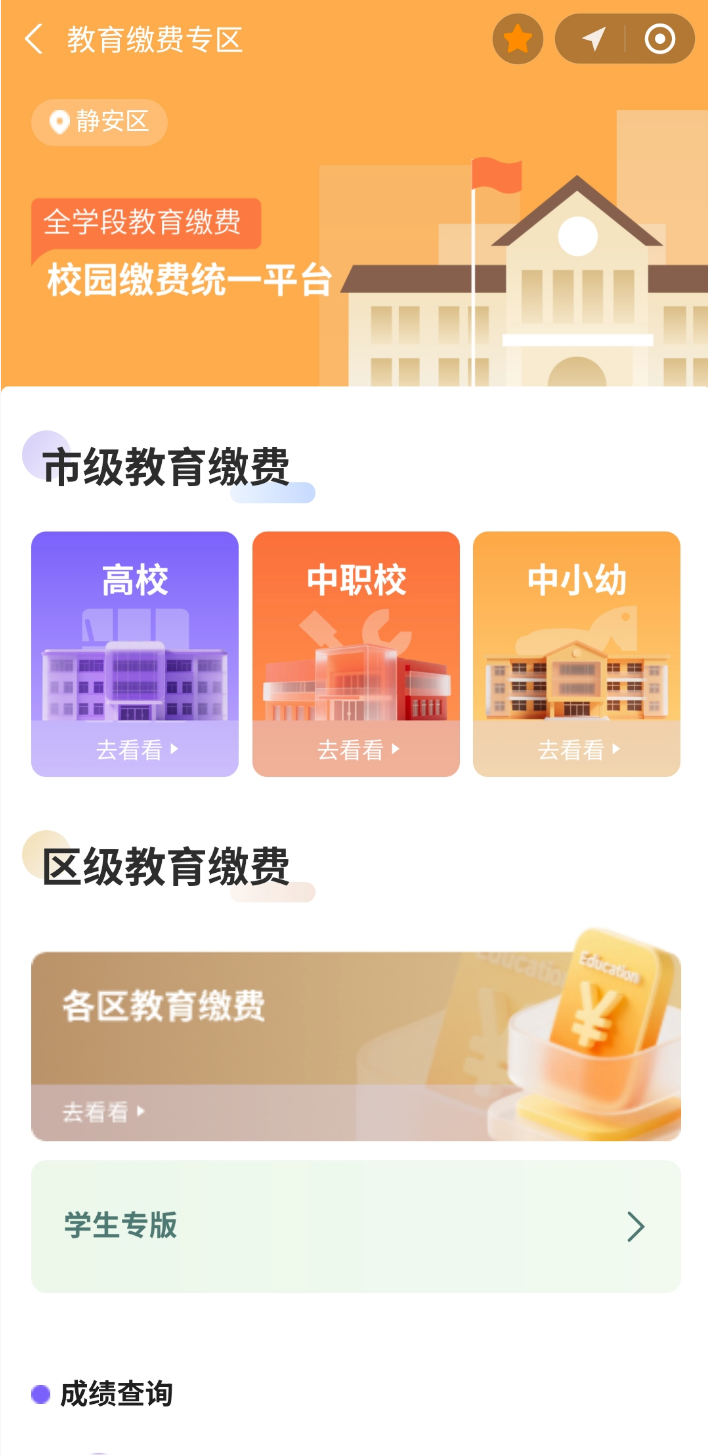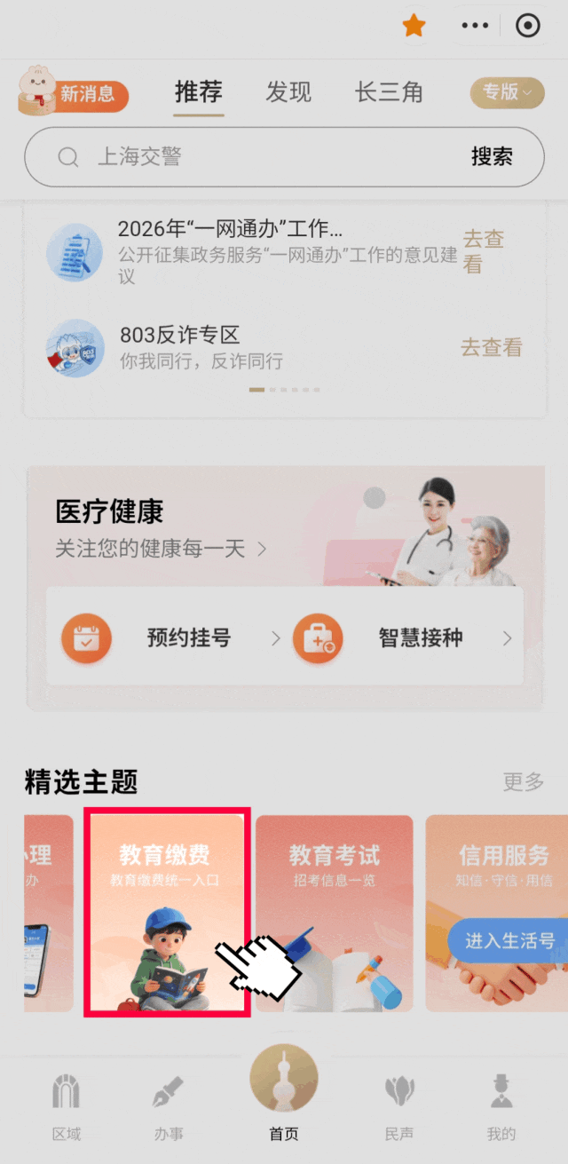 打开“随申办市民云”(APP、微信小程序或支付宝小程序均可),在首页搜索“教育缴费”,或下滑至“精选主题”板块找到“教育缴费”入口,点击即可进入教育缴费专区。