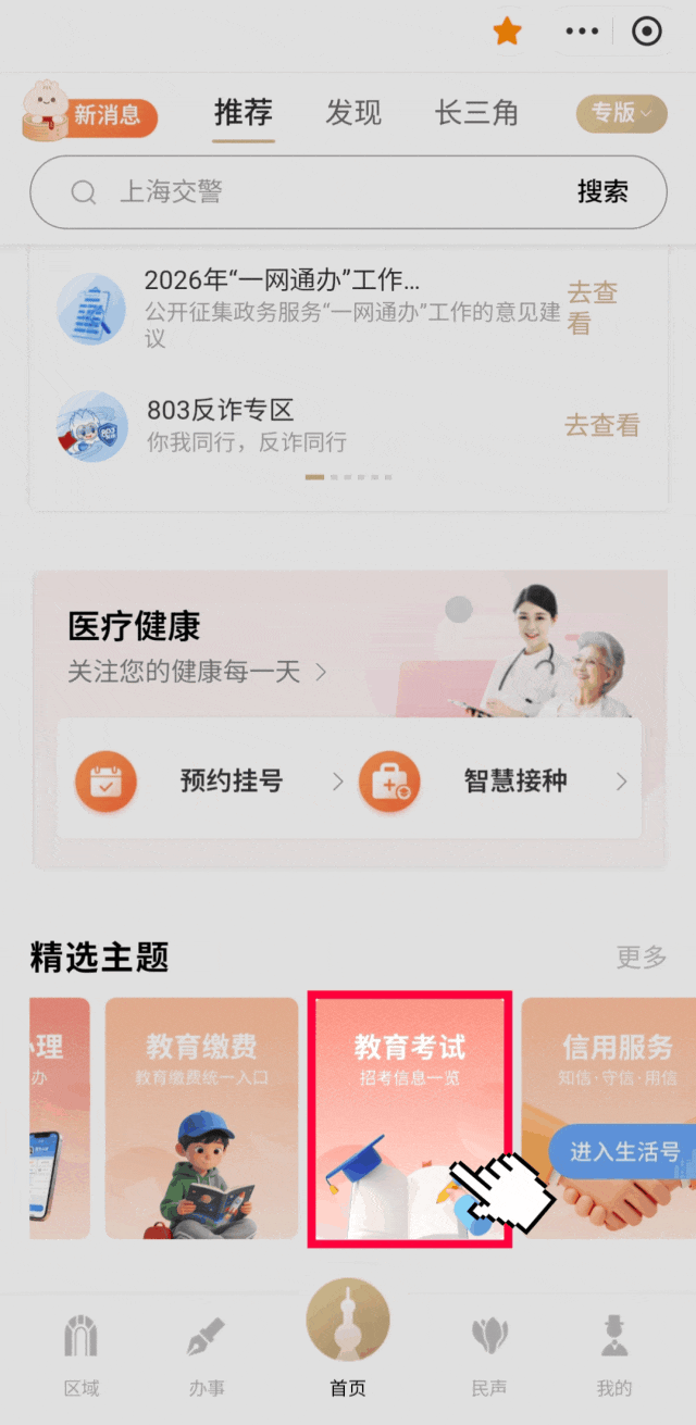 打开“随申办市民云”(APP、微信小程序或支付宝小程序),在首页搜索“教育考试”,或下滑至“精选主题”找到“教育考试”入口,进入教育考试招生专区。