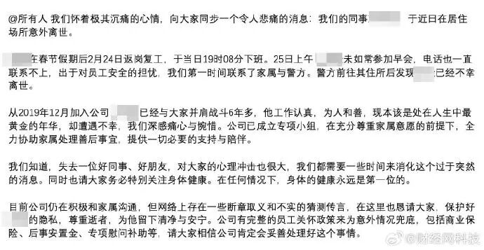 我们怀着无比沉痛的心情,向大家告知一个令人心碎的消息:我们的同事××意外离世。××在春节假期结束后,于2月24日返回工作岗位,当天19时08分下班。25日上午,××没有像往常一样参加早会,电话也始终无法接通。出于对员工安全的担忧,我们第一时间联系了家属和警方。警方赶到其住所后,发现××已经不幸离世。××自2019年12月加入公司,至今已与大家并肩奋斗6年多。他工作认真负责,为人亲切和善,正处于人生中最宝贵的黄金年华,却遭遇如此不幸,我们深感痛心与惋惜。