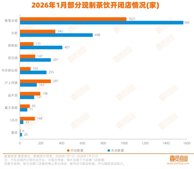 2026年1月现制茶饮行业动态:新开3125家门店,净增1208家