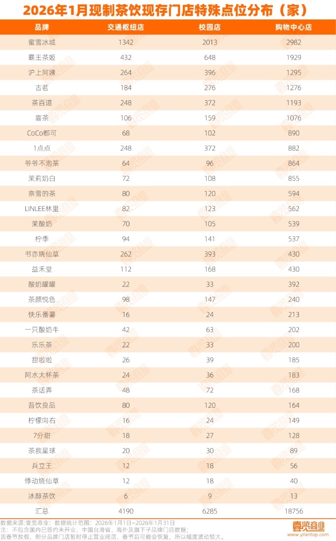 在交通枢纽点位,现制茶饮品牌在此布局的态度较为审慎,除蜜雪冰城有1342家门店外,仅霸王茶姬、沪上阿姨、古茗、茶百道、喜茶、1点点、书亦烧仙草、益禾堂在此分布超过100家门店。
