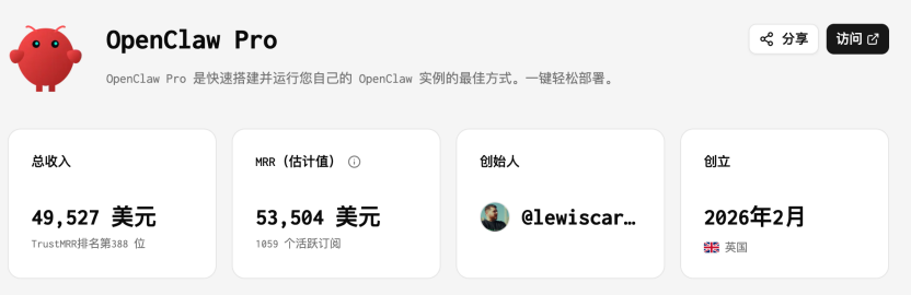 它主打“手机30秒部署OpenClaw”,在某一周流量爆发期内迅速起量,过去30天收入约8132美元。