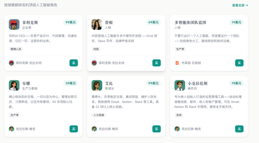 简单来说,用户无需懂提示词工程,可直接在上面购买经过实战检验的AI配置文件、工作流程指南,甚至是预设好性格和技能的“数字员工”,价格通常几十美元一个。