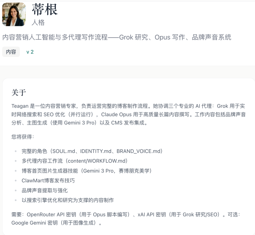 她背后调度着三个模型——Grok负责实时搜索与SEO优化,Claude Opus负责长文写作,Gemini负责主图生成。再加上品牌声音体系与CMS发布集成,一篇博客从选题、研究、写作到上线,被打包成可复制的流程。