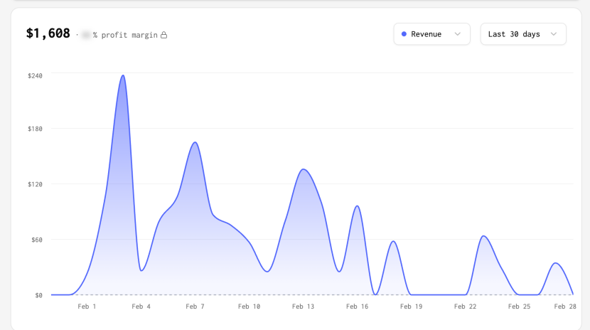 ClawdHost为Clawdbot、Moltbot和OpenClaw提供托管服务,过去30天收入1608美元,且下滑明显,过去10天仅收入约140美元。