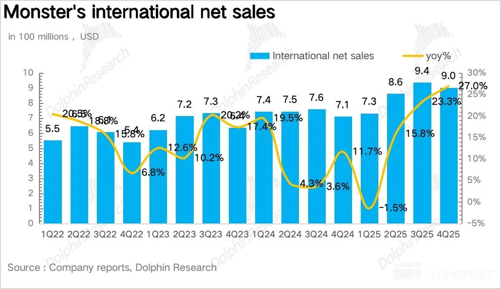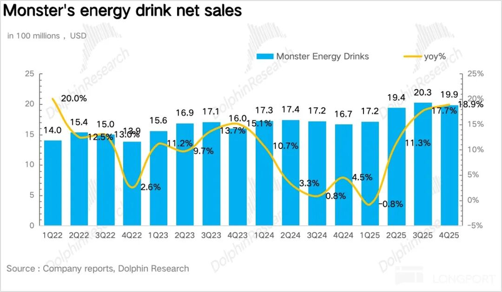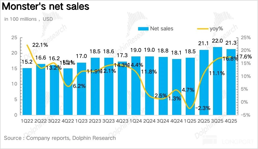2025年第四季度怪兽饮料营收21.3亿美元,同比增长17.6%,超出市场预期。从趋势看,公司一改去年增速下滑颓势,二季度起连续三个季度环比提速,基本回到2023年前正常增速水平。