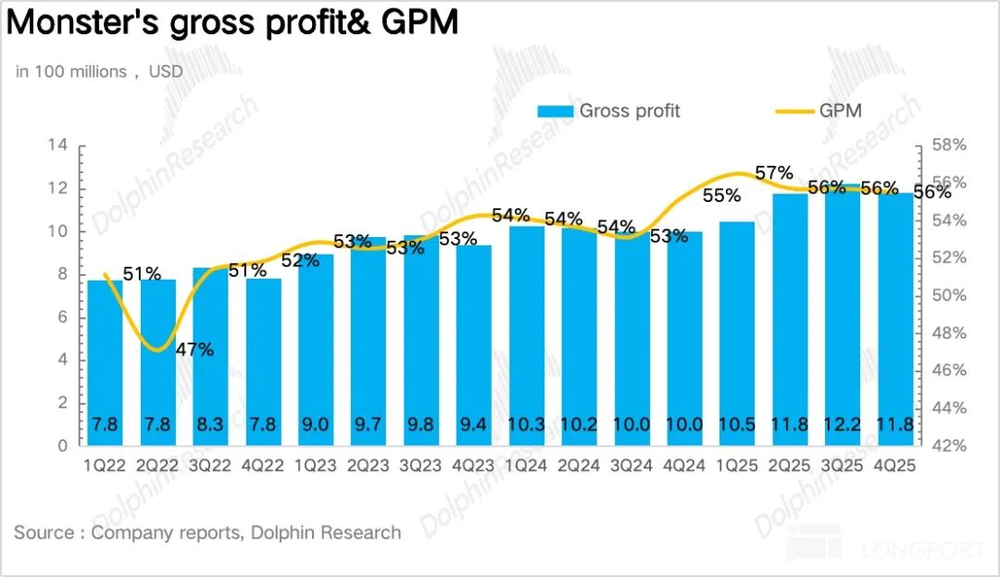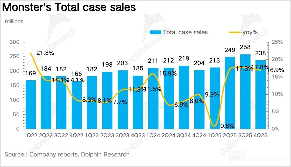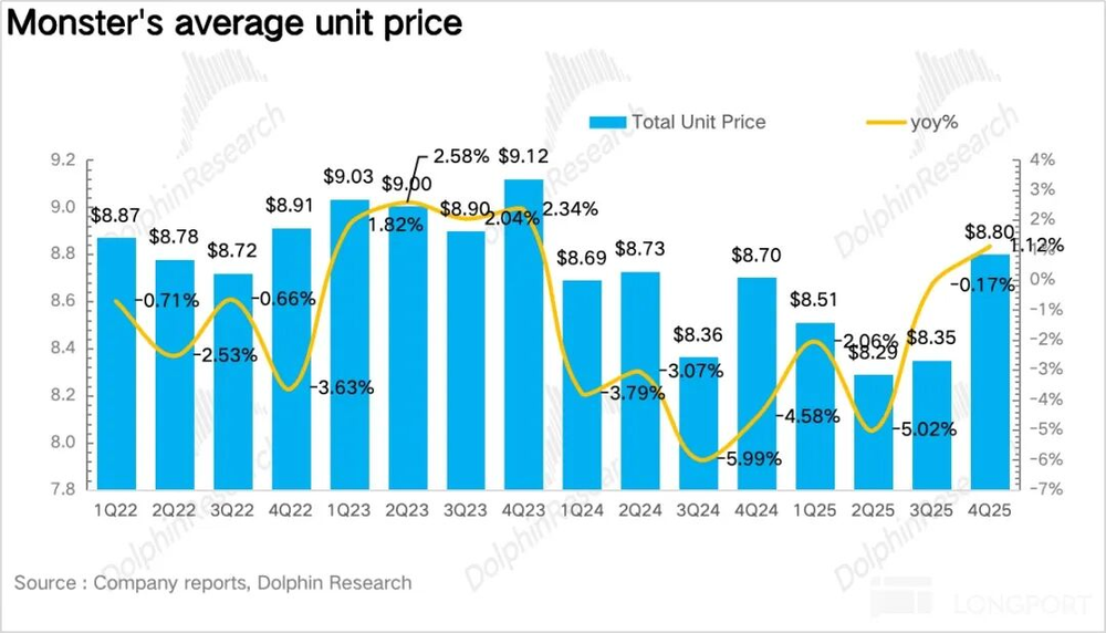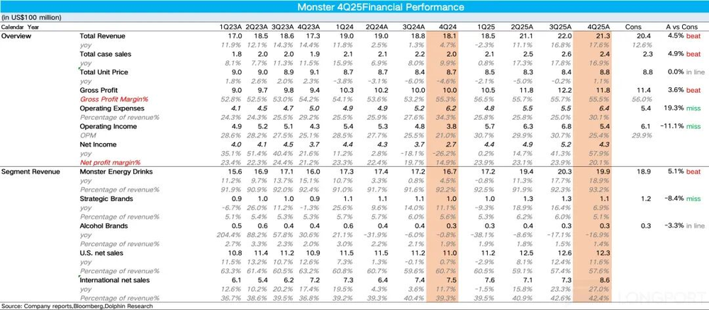 1、收入增速创单季度新高。从整体数据看,2025年第四季度怪兽饮料营收同比增长17.6%,环比二、三季度持续提速。量价拆分显示,单位箱销量同比增长17%,表明公司调整策略(加大健康品类推新与运营力度)效果显著,在能量饮料市场的份额持续修复。