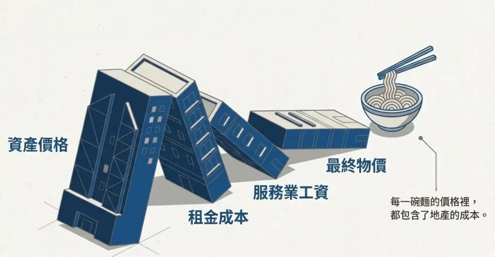 楼价决定租金,租金影响居住和商铺成本,进而影响服务业工资,最终体现在物价上。香港资产价格长期整体偏高,住宅、商铺租金高,推高服务业工资和整体物价。