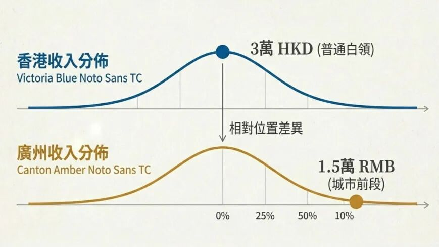 在香港,月入三万港币属普通白领水平,处于城市收入中段,能维持生活却难有阶层跃升感。在广州,月入一万五人民币对刚毕业月入五六千的年轻人而言,已属收入前段,意味着相对稳定体面。