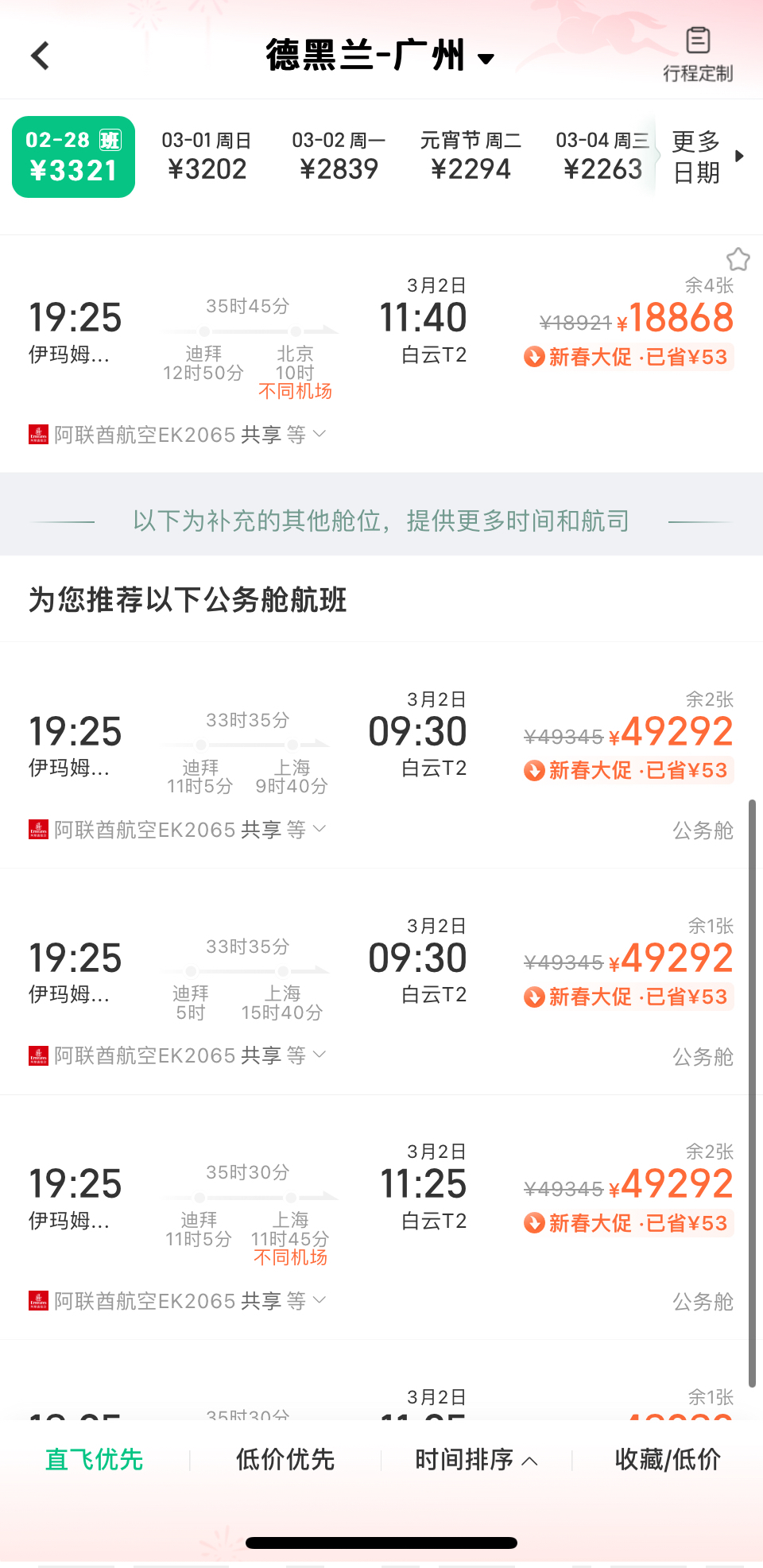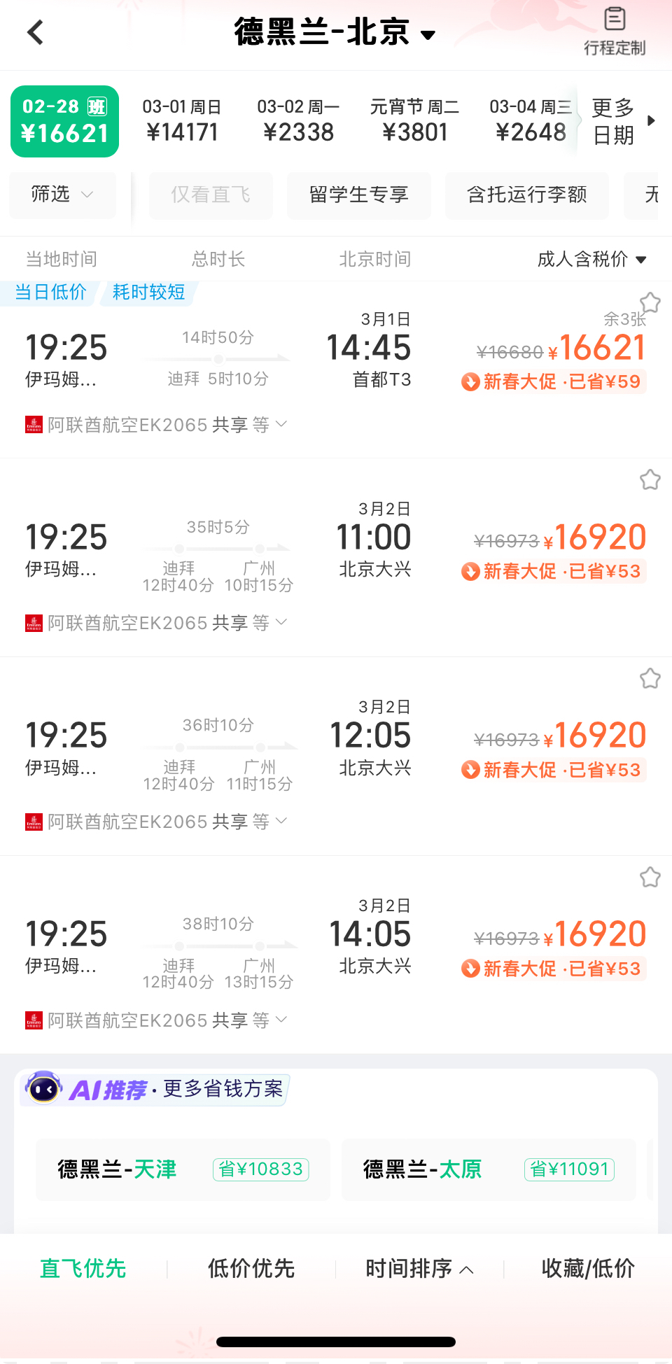 同程旅行的数据显示,2月28日,德黑兰飞往北京的机票最低价格已超1.6万元,最高达2.1万元;当天从德黑兰返回上海的航班无直飞可选,最低票价达4.4万元;而德黑兰至广州的公务舱最高票价也接近5万元。