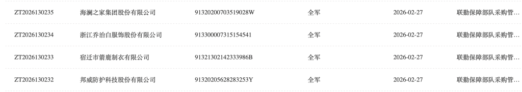 同一天,军队采购网还发布了对浙江乔治白服饰股份有限公司、宿迁市箭鹿制衣有限公司、邦威防护科技股份有限公司的暂停处理公告概要。这三家公司同样因中标后无正当理由拒不签订合同,按照军队供应商管理相关规定,自2026年2月27日起被暂停参加全军物资工程服务采购活动的资格。