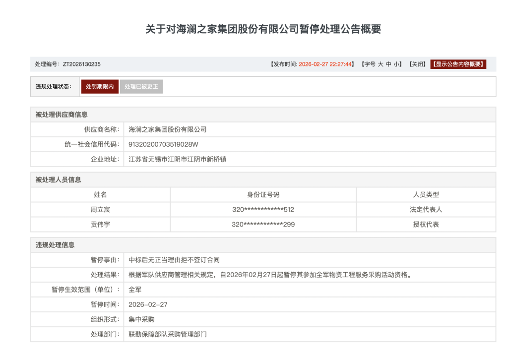 近期,军队采购网发布的一则针对海澜之家集团股份有限公司(股票代码:600398)的暂停处理公告概要表明,该公司(统一社会信用代码:91320200703519028W)由于中标后无正当理由拒绝签订合同,依据军队供应商管理的相关规定,从2026年2月27日起,暂停其参加全军物资工程服务采购活动的资格。此次处理由联勤保障部队采购管理部门负责,暂停生效范围覆盖全军。