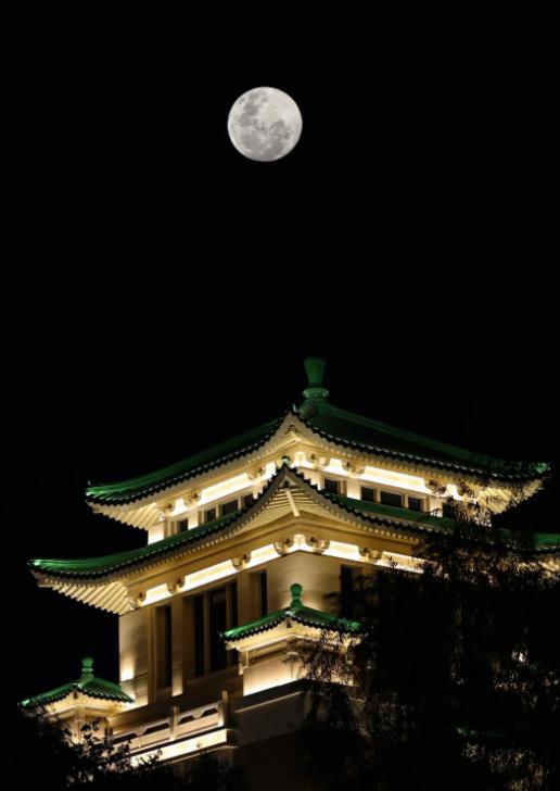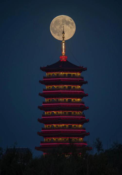 长春市北湖公园,澄澈明月高悬天幕,清辉如练洒在塔尖,格外圣洁。