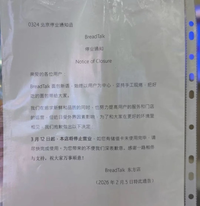 通知中提到:“面包新语BreadTalk始终以用户需求为核心,坚持手工现烤工艺,致力于为消费者带来美味面包。在追求产品新鲜度与品质的同时,我们也持续优化服务体验与门店运营。但受近期外部因素影响,为了未来能以更优质的环境与大家重逢,我们遗憾决定:自2026年3月12日起,本店停止营业。请持有储值卡的顾客尽快完成消费,由此带来的不便我们深表歉意。感谢大家一路以来的陪伴与支持,祝愿各位万事顺意!”