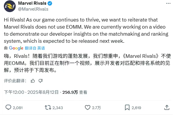 近期《漫威争锋》玩家对匹配机制的不满达到顶峰,除了争议较大的ELO机制,不少玩家怀疑官方还使用了“EOMM”机制——尽管官方去年年中曾发声明否认这一点。