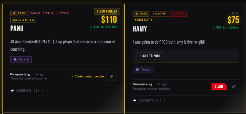 这个名为Intlist的网站运营模式类似古代“赏金猎人”体系:任何人都能将游戏中遇到的故意送输的“坑队友”ID发布到网站,并标注愿意支付的赏金(最低5美元),其他用户可“揭榜”执行任务。