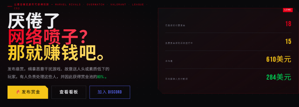 该网站的悬赏服务覆盖了《CS2》《守望先锋》《无畏契约》《漫威争锋》等主流射击游戏,其中《漫威争锋》的参与玩家最多。