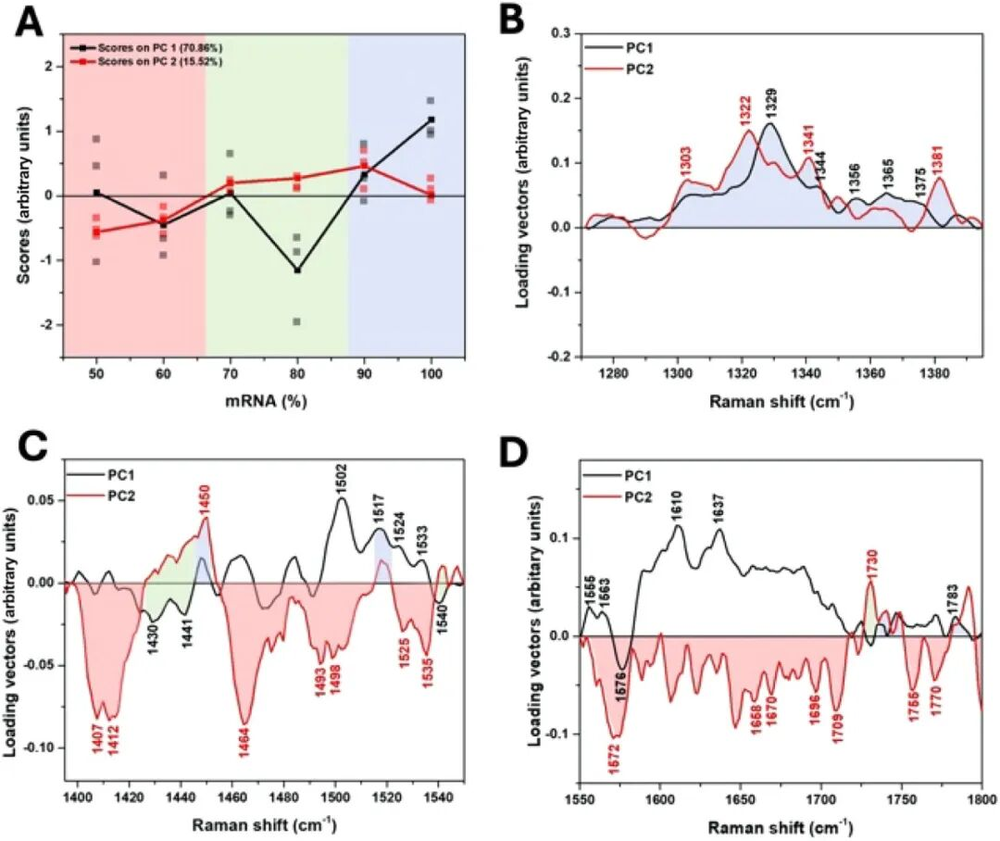 主成分分析(PCA):清楚地揭示出,1270 - 1800 cm⁻¹波数范围内的光谱变化和脂质含量高度相关。这一区域正好对应mRNA碱基的环振动模式,说明当mRNA和脂质相互作用或被包裹时,其碱基的微环境改变了。