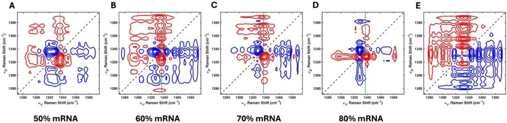 图5.以100%mRNA的DUVRR光谱为参考光谱,以mRNA与脂质的比例为样品光谱,在1270–1395 cm⁻¹区域内获得的2T2D - COS光谱。图中展示了50%mRNA(A)、60%mRNA(B)、70%mRNA(C)、80%mRNA(D)和90%mRNA(E)的光谱。绿色虚线表示1334 cm⁻¹谱带。