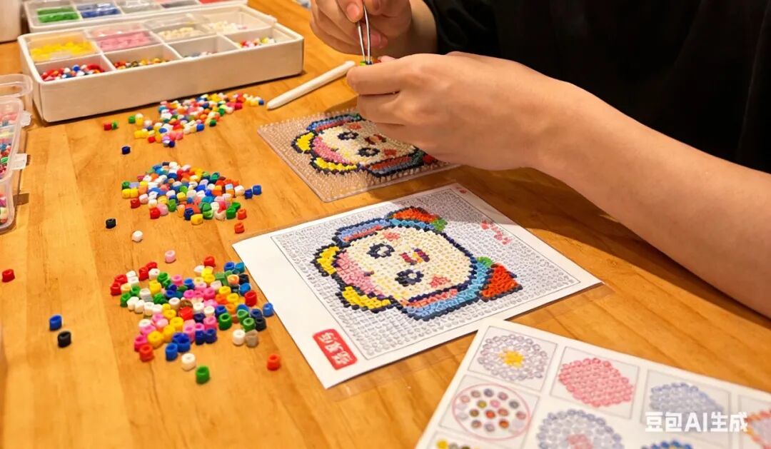 商场的DIY手作馆里,年轻人围坐在桌前,用镊子夹着彩色小豆子拼出各种IP形象;不少都市白领的工位一角,也摆放着拼豆作品。
