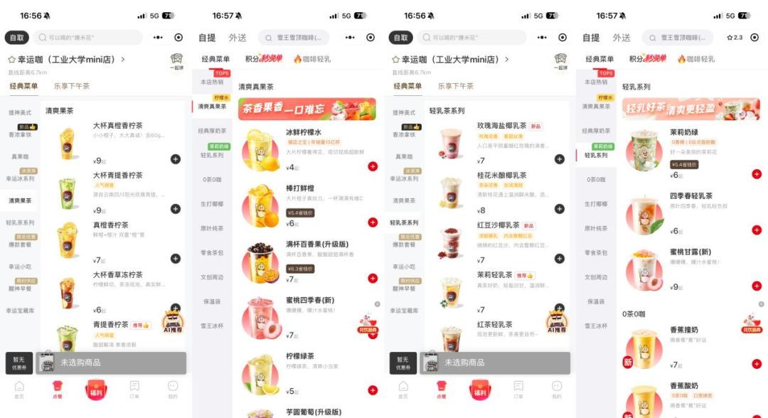其次,产品与价格带的区隔逐渐模糊。幸运咖主力产品价格集中在5-13元,蜜雪冰城则为4-9元,存在明显重叠。此外,幸运咖除咖啡外,还销售冰淇淋、果茶、轻乳茶等非咖啡类饮品,与蜜雪冰城形成直接竞争。