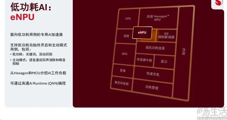 作为骁龙Wear、骁龙W系列的后续产品,骁龙可穿戴平台至尊版的最大升级是摒弃了Cortex-A53这一老旧CPU架构,采用Cortex-A78+Cortex-A55的“大小核”组合。同时,它升级为Adreno 800系GPU,并首次加入eNPU+Hexagon NPU的双NPU设计,端侧算力达到10TOPS。