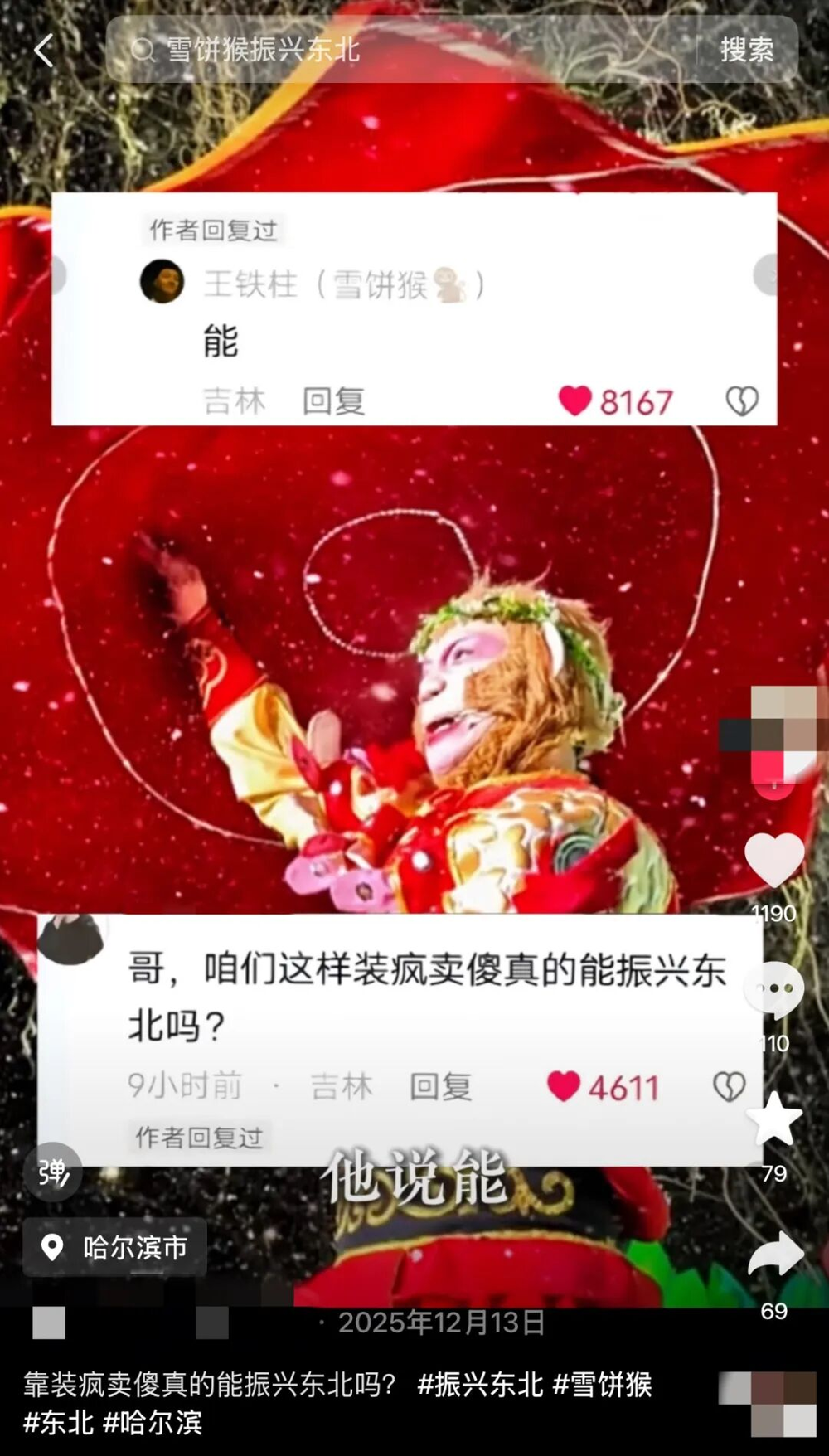 正月初九,“雪饼猴的遗憾”登上短视频平台热搜第一。这位受全网喜爱的“凡人大圣”,袒露了心底柔软的遗憾:“二人转的手绢,是父亲留给我的唯一遗产”。父亲在他十二岁时离世,万千情绪化作哽咽的告白:“爸,儿子收到”。他没有筋斗云,只是在振兴东北的路上稳步前行。