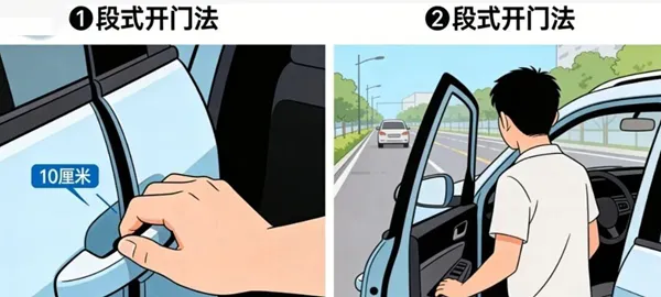 第一步:开门时不要一次性完全推开,先打开一条约10厘米的小缝。第二步:通过门缝观察后方的行人和车辆动态,确认没有安全隐患后,再缓慢推开车门下车。