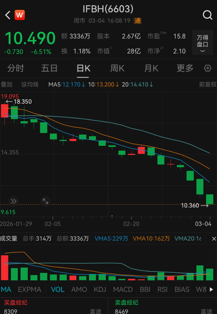 目前IFBH每股报10.49港元,总市值为28亿港元。而IFBH上市首日的收盘市值为105.3亿港元,这意味着自上市以来,其市值已蒸发77.3亿港元。
