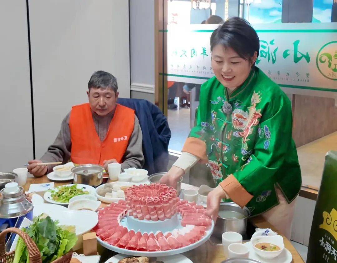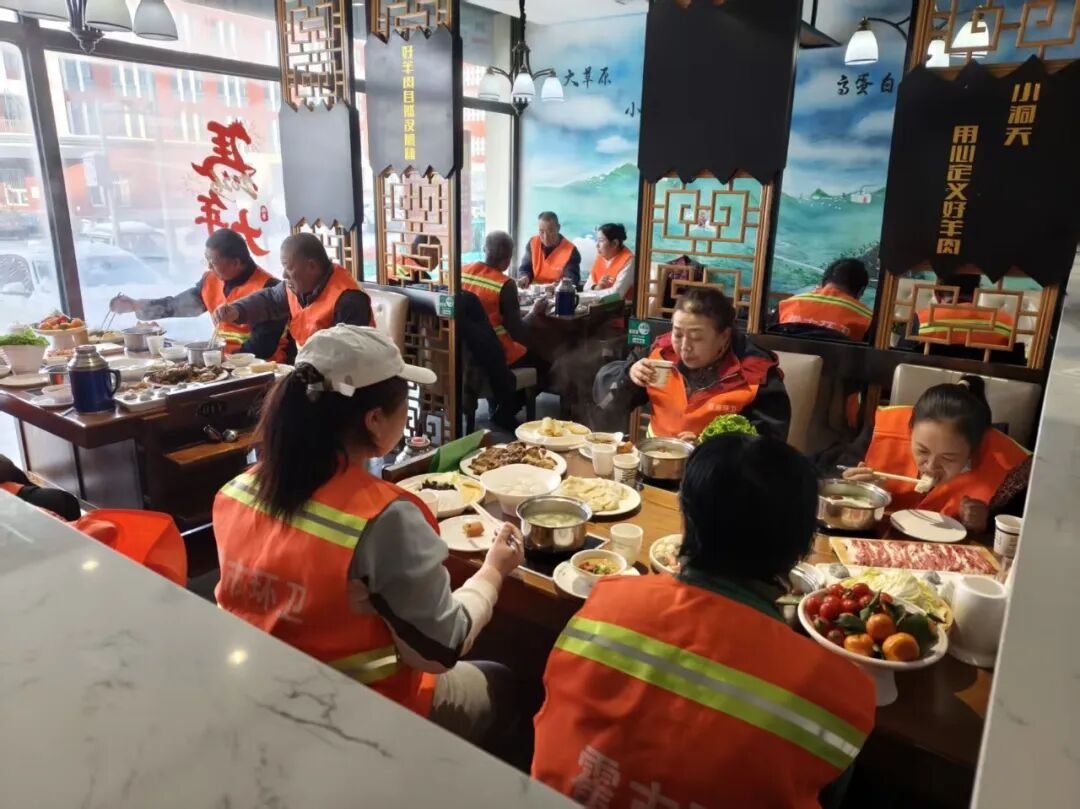 火锅店负责人敖秀花和工作人员一起给环卫工人上菜,一盘盘新鲜的羊肉整齐摆上桌,纹理清晰、颜色鲜亮,还有翠绿的青菜、软糯的汤圆依次端来,每一份食材都分量充足、摆放精致。“一定要让大家吃好、吃饱,暖到心里去。”敖秀花一边上菜,一边笑着说。