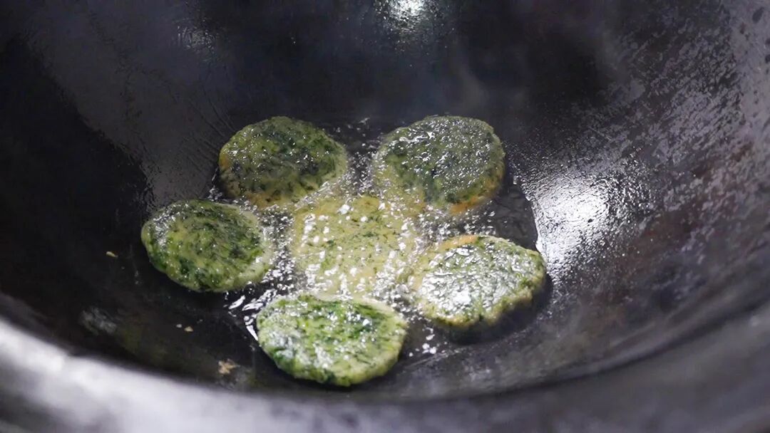 土灶里燃起橙红的火光,锅中倒入足量的油,胡伟把塌饼贴着锅边逐个滑入。在柴火灶不疾不徐的温度下,塌饼两面慢慢煎得金黄,草头的清香、糯米的软糯与油脂的焦香交织在一起,勾得人食欲大增。
