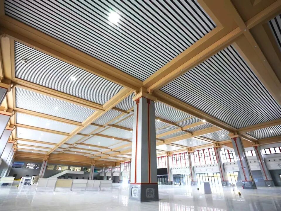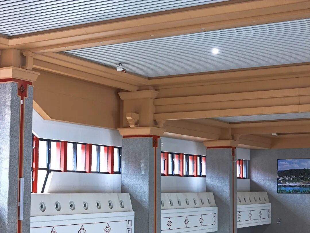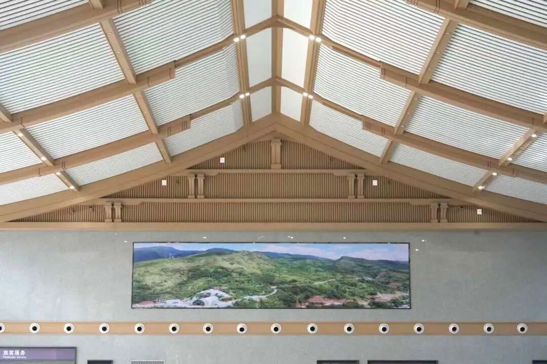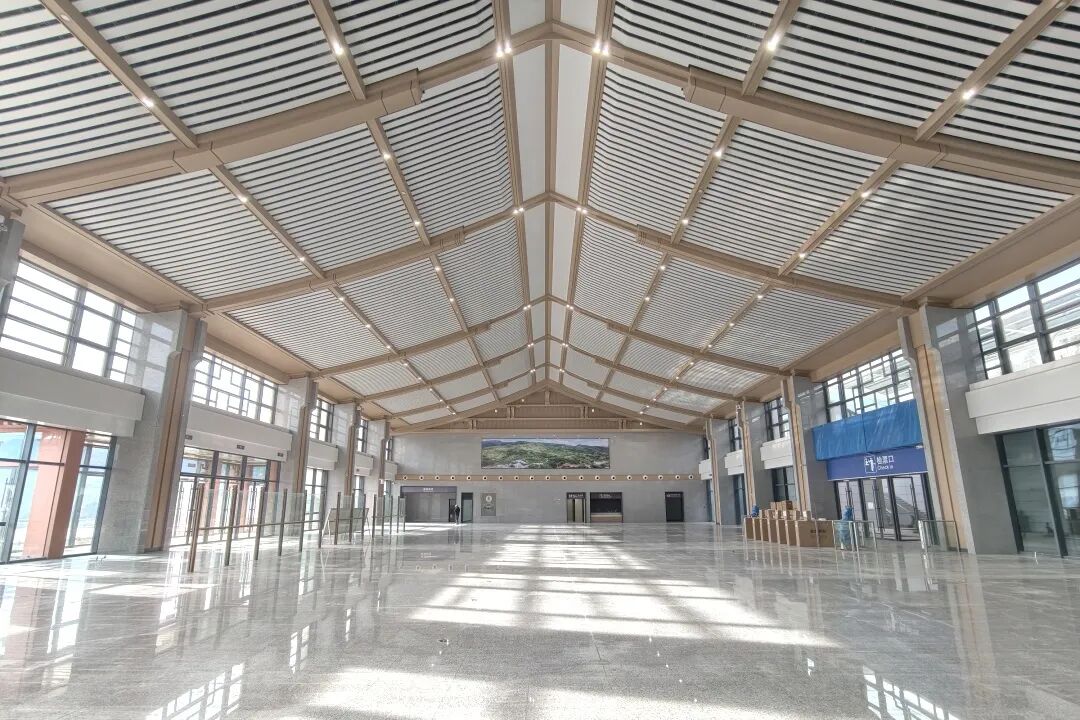 商洛西站地处商洛市,设计创意为“幽幽商山匿仙境,盈盈洛水诞尘间”,屋顶随功能高低起伏,与秦岭山形呼应,暗含南北文化交融之意。候车大厅以汉代风格为基调,天花板用叠层线条模拟秦岭龙脉,平直舒展的造型搭配微翘檐角与朴实脊饰,呼应“秦楚咽喉”历史地位,营造现代交通空间。