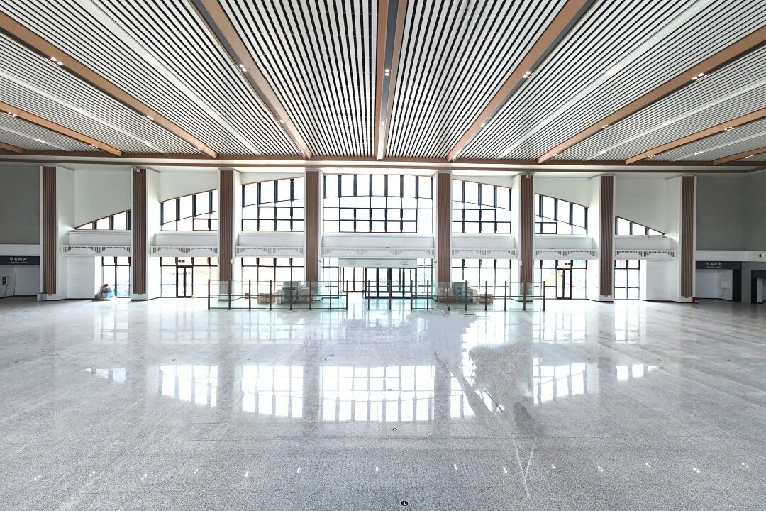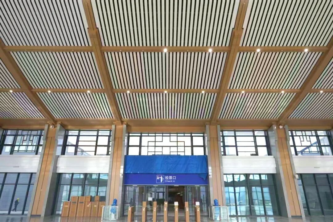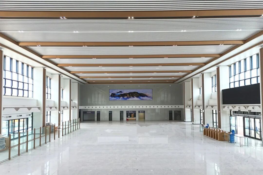 山阳站位于商洛山阳县,以“峻岭崇山风光秀,平川美景画无边”为创意,将当地自然地貌与地域特征融入建筑。候车大厅以金杏色与粉色为基调,天花板用柔曲线条勾勒流岭、鹃岭等山形,呈现“三山夹两川”地貌。