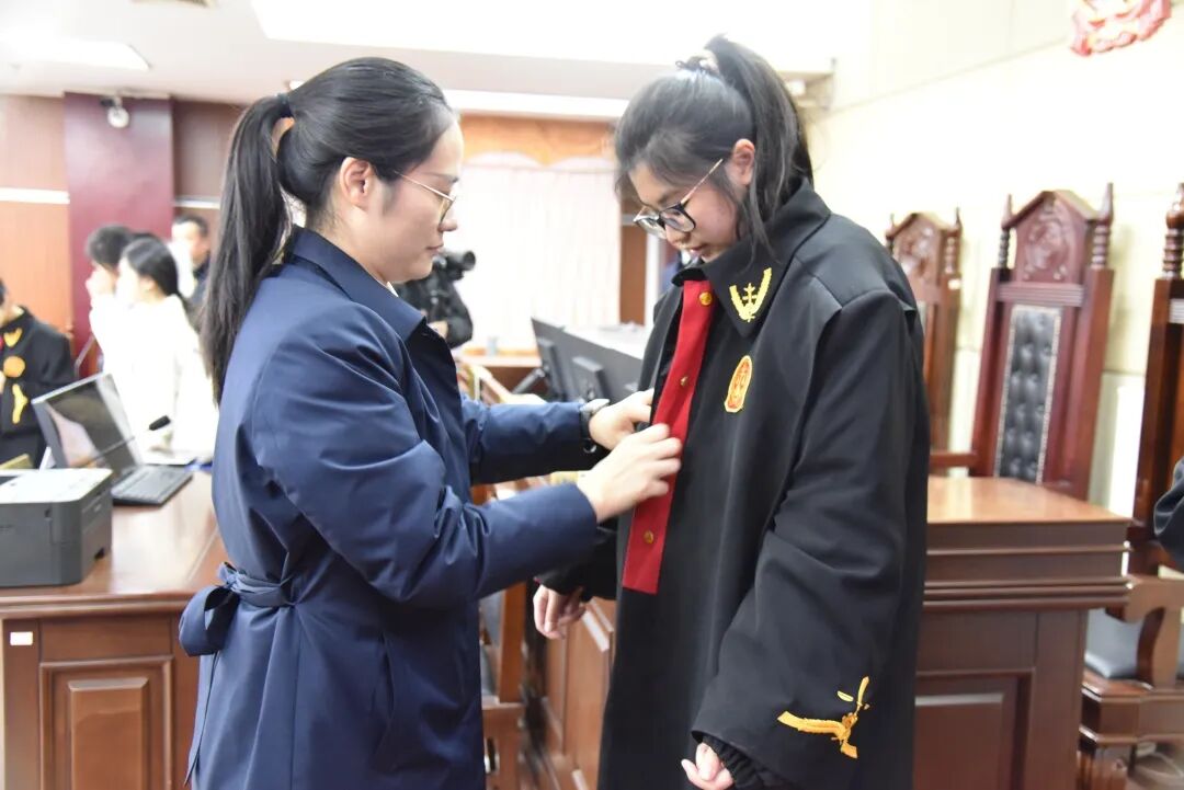 在唐娌的指导下,同学们迅速“变身”。穿上法袍的“小法官”们,神情瞬间变得庄重。随着“小法官”略显紧张却清晰的“现在开庭”声,法槌敲响。一旁的家长们纷纷用手机记录下孩子这珍贵的成长时刻。