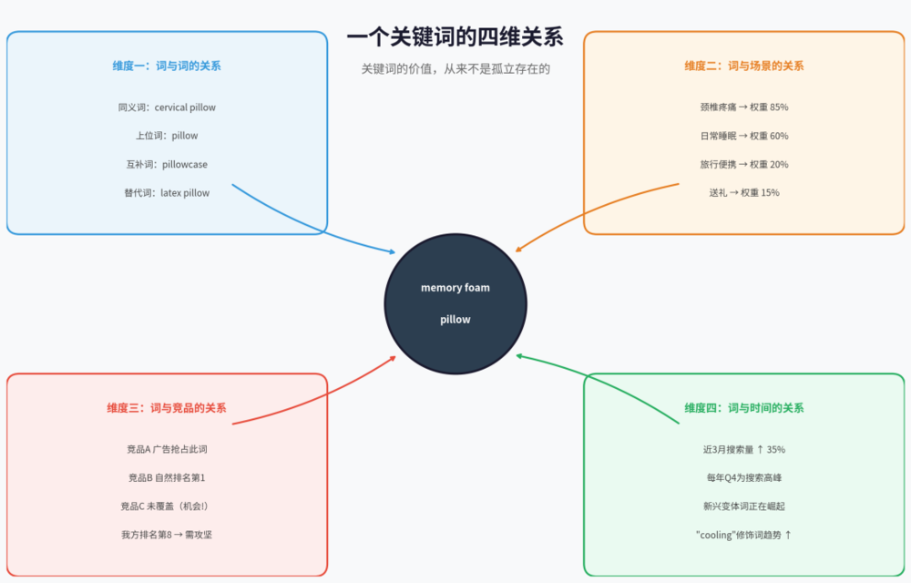 但在AI时代,这种简化反而成为利用AI能力的最大障碍。我们需要转向“关系思维”——不再把关键词看作孤立的点,而是巨大网络中的节点,其价值由与其他节点的关系共同定义。这些关系至少包含四个维度: