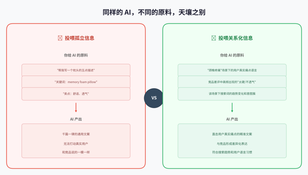 实际上,现阶段多数AI仍依赖对语料的LLM分析,背后存在“垃圾进,垃圾出”的现实——输入AI的“原料”质量直接决定输出“成品”的质量。若我们提供的只是孤立的关键词和卖点,AI只能给出看似专业却千篇一律的“标准答案”。