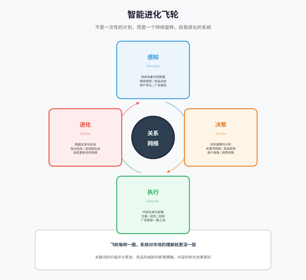 进化(Evolve):执行结果(如广告的真实点击和转化数据)会作为新养料反哺“感知”环节,让整个关系网络不断校准,越来越精确。