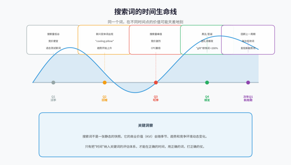 搜索词有其生命周期,会经历萌芽期、成长期、成熟期和衰退期。其商业价值(即KVI-Key Value Index)会随季节、节日、市场事件和竞争环境发生剧烈变化。