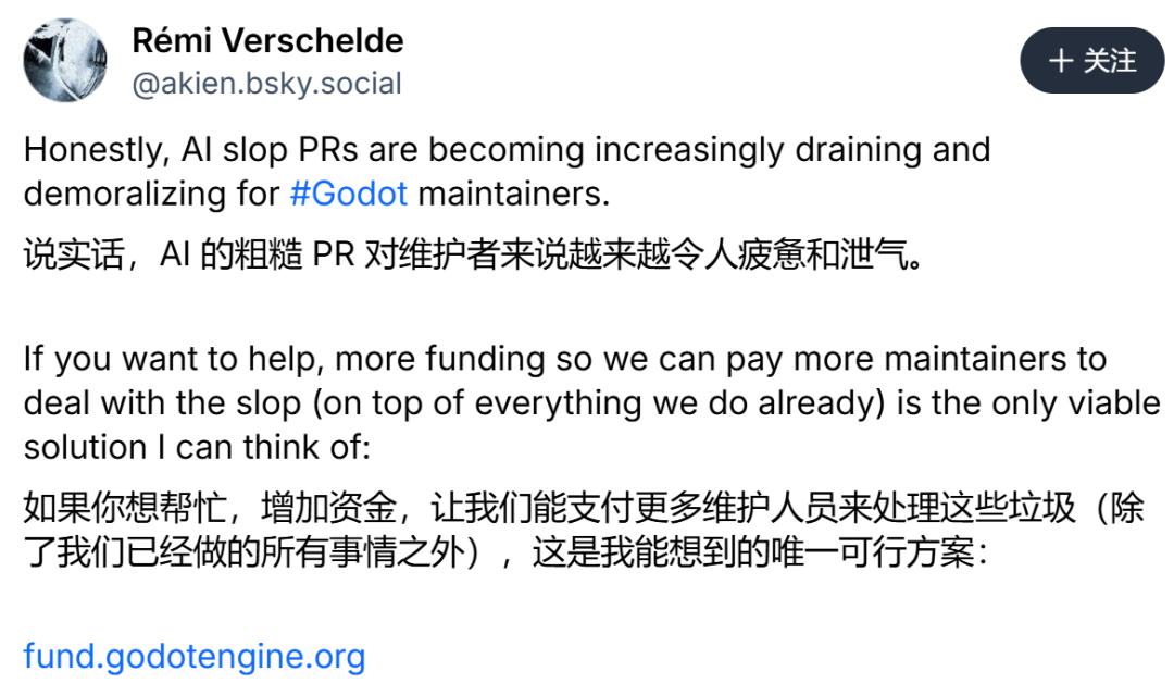 参考链接:https://www.pcgamer.com/software/platforms/open-source-game-engine-godot-is-drowning-in-ai-slop-code-contributions-i-dont-know-how-long-we-can-keep-it-up/
