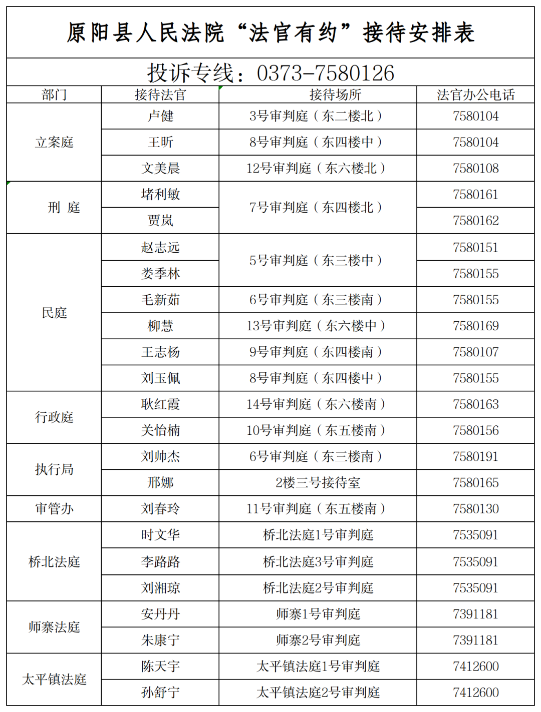 为切实满足群众的司法需求,进一步拓宽当事人与法官的沟通途径,新乡市两级法院推行“法官有约”固定接待日机制,每周五下午15:00至17:30,法官将与案件当事人面对面开展释法、答疑与解惑工作。为方便当事人预约见面,现将原阳县法院3月6日“法官有约”的接待安排公示如下: