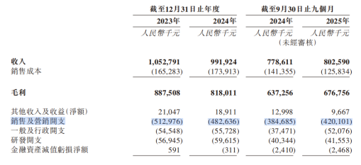 招股书显示,2025年前三季度公司实现营收8.03亿元,尽管有着远超行业平均水平的84%超高毛利率,最终净利润却仅为1.45亿元,较上年同期下滑6.1%,而吞噬利润的正是巨额的营销投入。