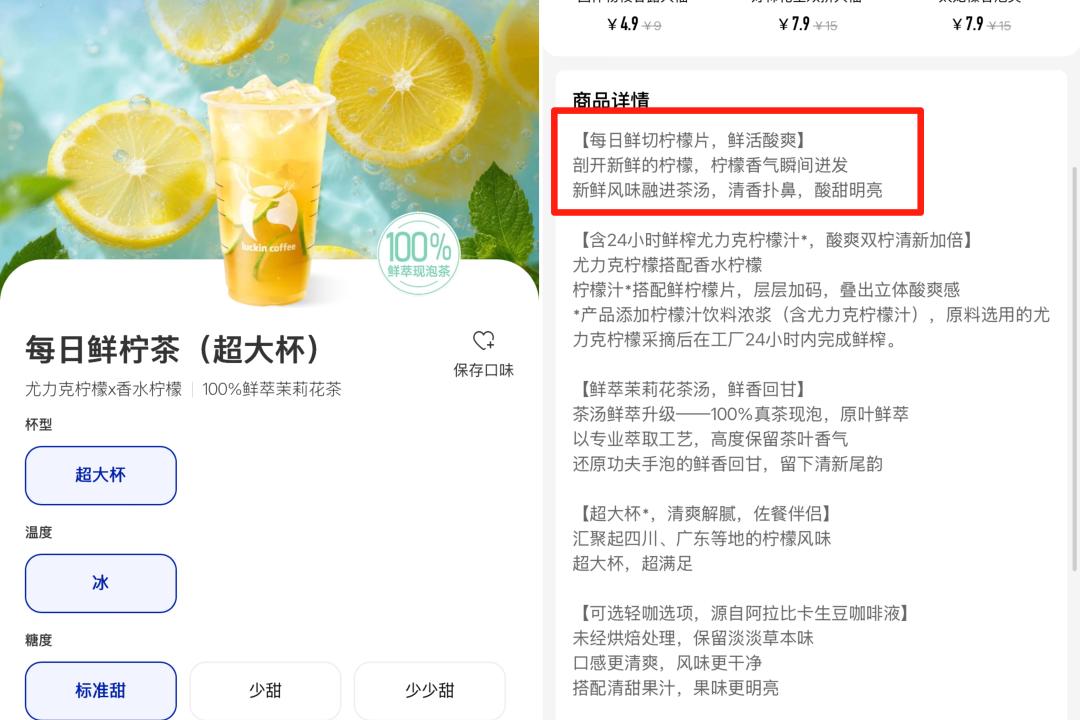 3月4日,深圳地区上线“鲜切水果系列”饮品,包含橙C美式、香柠茉莉美式、每日鲜柠茶、大果粒葡萄鲜柠茶四款,每款产品介绍均提及“鲜切柠檬片”。
