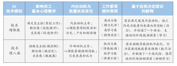 综合来看,增强感路径下,AI辅助系统为员工提供工具和信息支持,使其更自由安排工作,完成更高难度任务,并通过良好人机氛围满足情感需要,满足自主性、胜任感和归属感需求,进而提升工作繁荣感。而侵入感路径下,AI辅助系统可能削减员工对工作的控制权,引发技能退化担忧,减少组织中的人际连接,干扰需求满足过程。在这种压力下,员工难以体验工作中的活力和学习感,工作繁荣感随之下降。表1总结了这两类技术感知对工作繁荣感的影响机制及基于自我决定理论的解释。